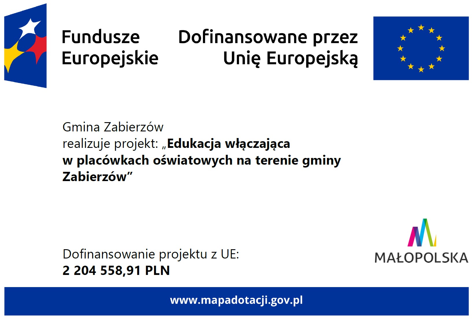 Gmina Zabierzów realizuje projekt pn. „Edukacja włączająca w placówkach oświatowych na terenie Gminy Zabierzów”, dofinansowany ze środków Europejskiego Funduszu Społecznego Plus w ramach programu Fundusze Europejskie dla Małopolski 2021–2027.